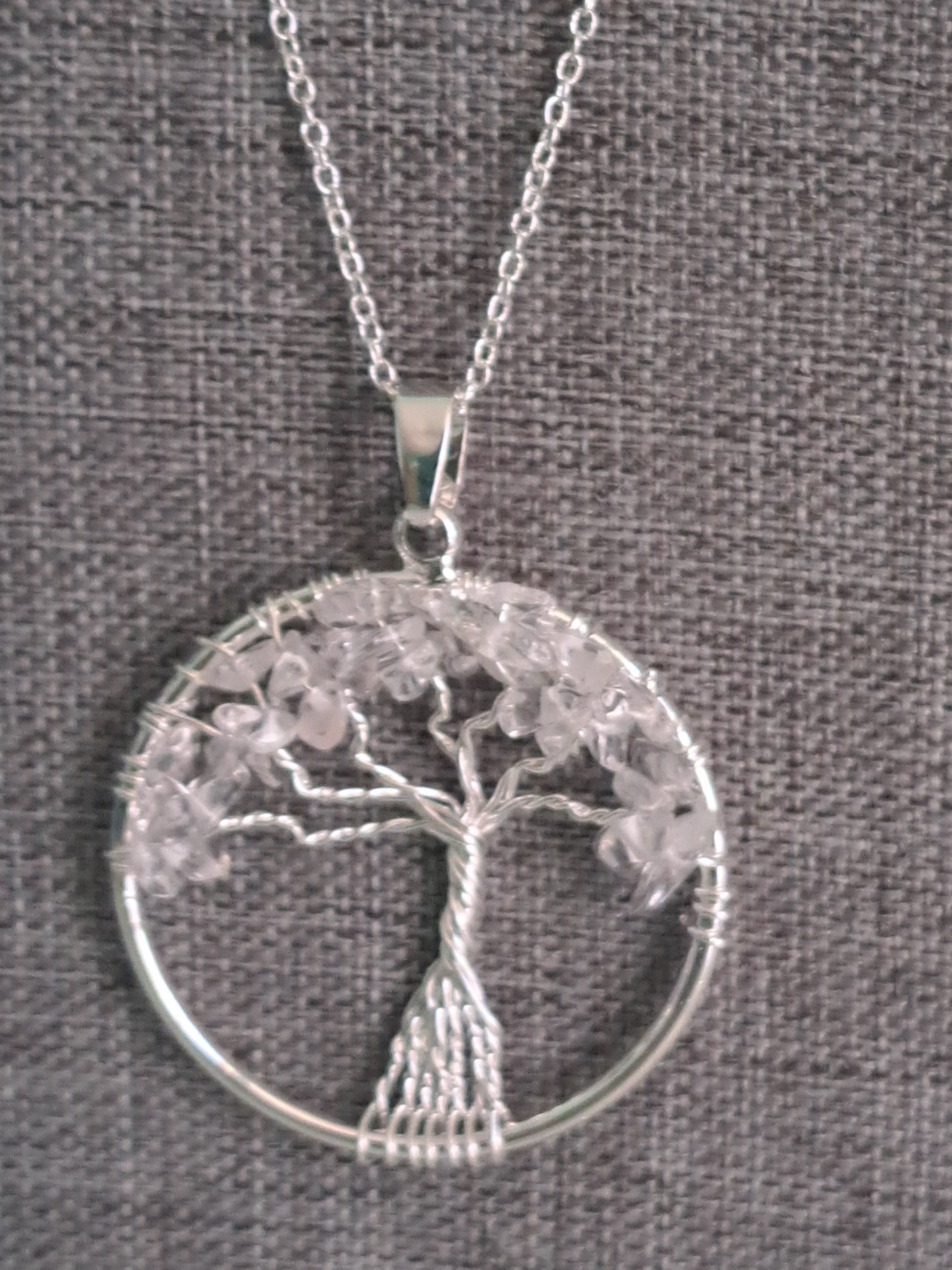 This is a clear quartz chip, tree of life pendant on an 18 in chain.