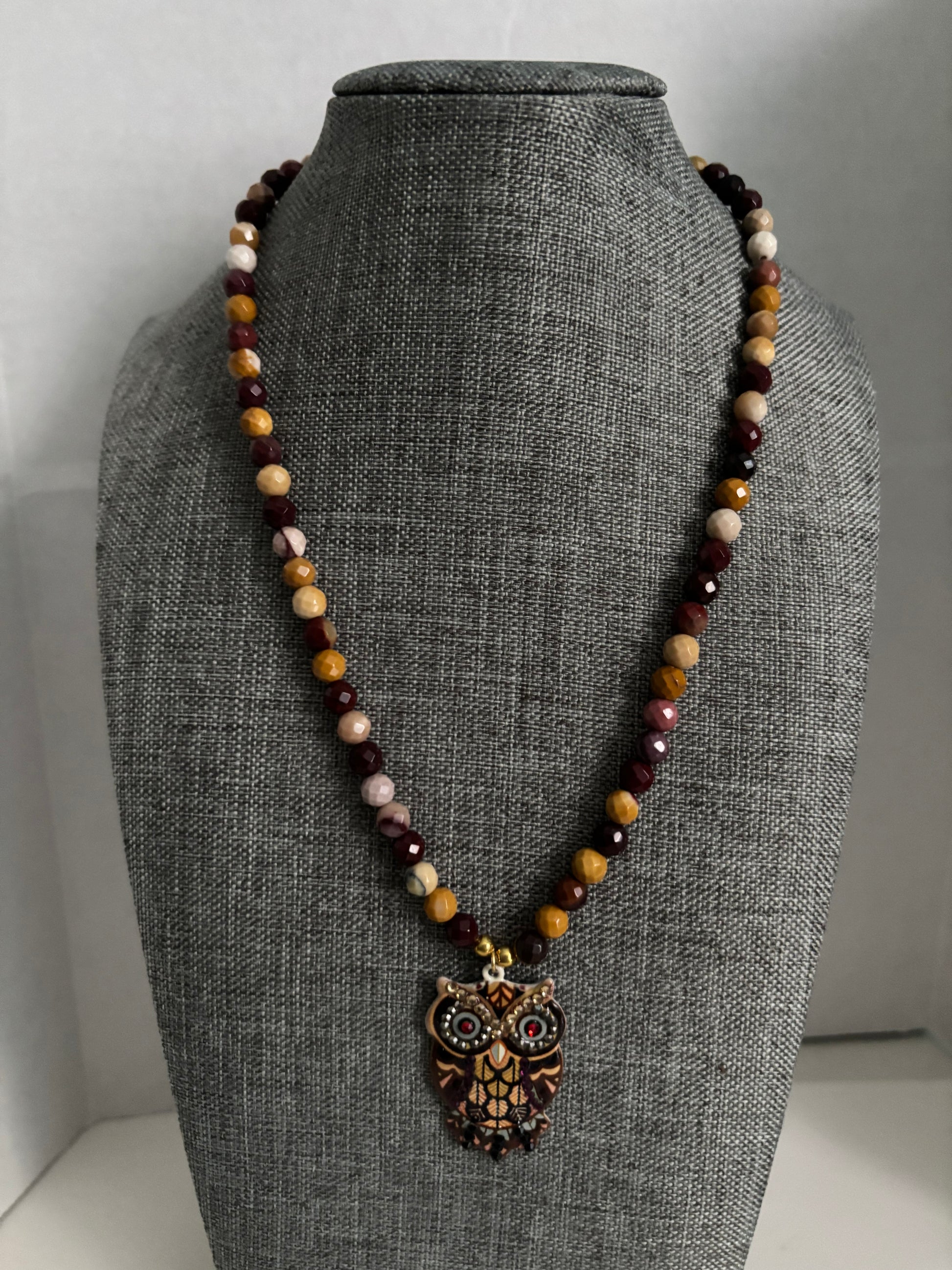 Mookaite Stone Owl Necklace, Boho Earth-Tone Beaded Statement Piece